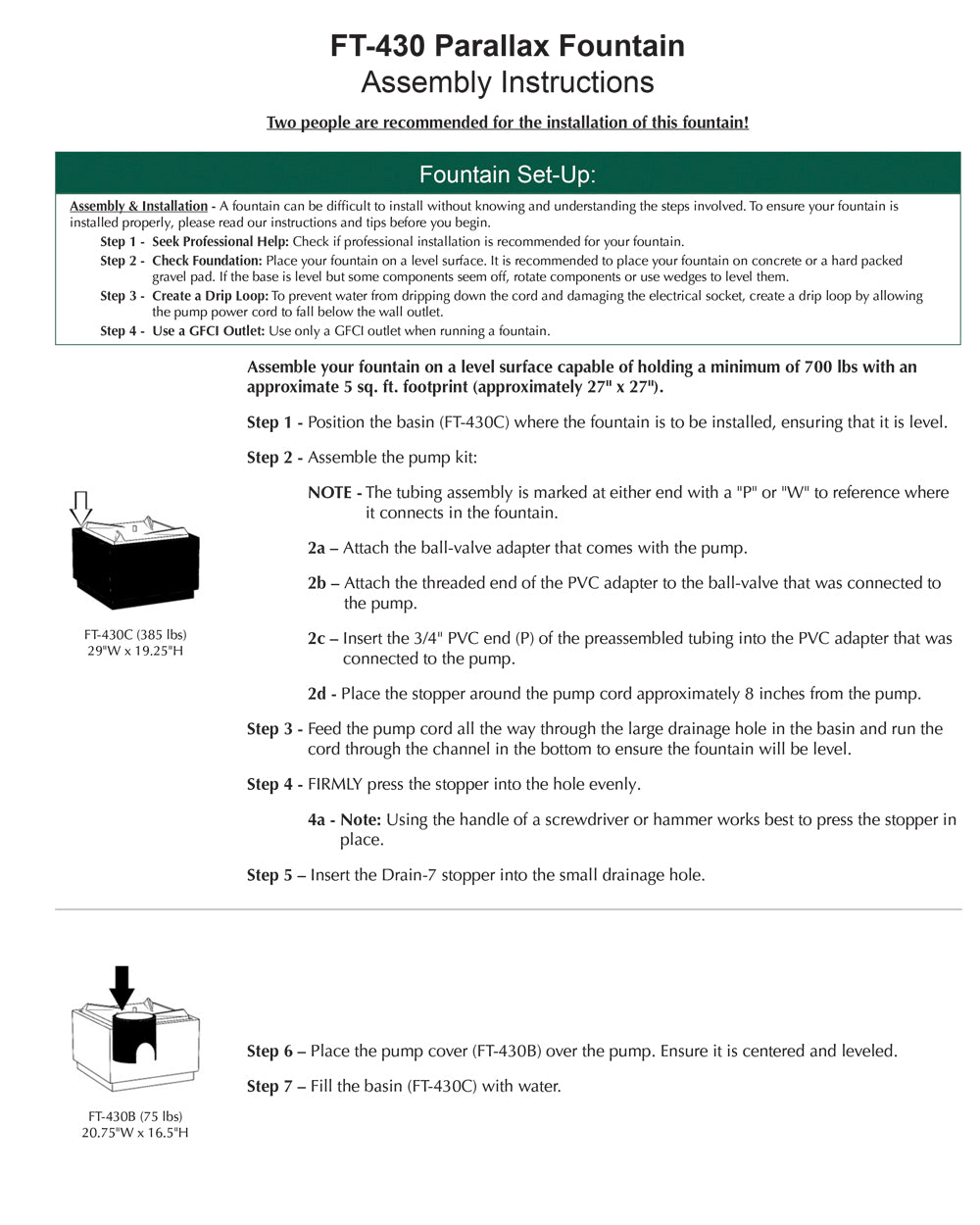 We suggest that birdbath/fountain tops not be left outside in the winter. Once the top fills with water/snow and freezes, the top may crack. All birdbath/fountain bases, bench legs and statuary should be raised up off the ground in winter so they will not freeze to the ground surface. Ideally, a fountain should be stored indoors in the winter away from the elements. However, if a fountain bowl must be left outside, remove all pumps, rubber stoppers, drain pipes, finials and small components, and cover the top with burlap or any absorbent material (old blanket/towel) and then wrapped with dark plastic, making sure that water does not accumulate in the basin and freeze. Fountain pumps, finials, and other small components should be stored indoors. Check the fountain periodically to insure that the cover is secure and water is not accumulating in any fountain component.