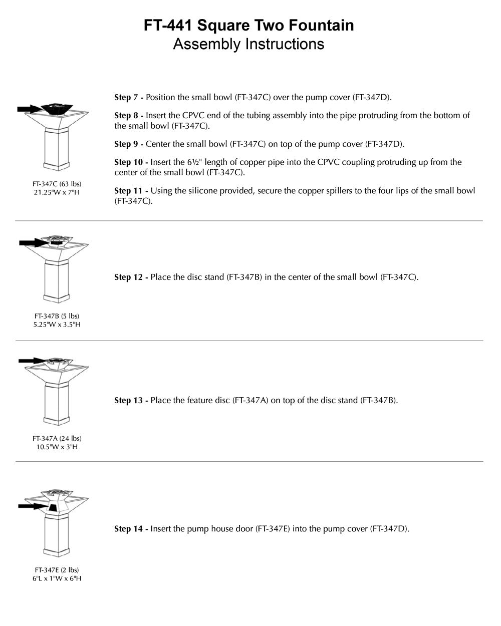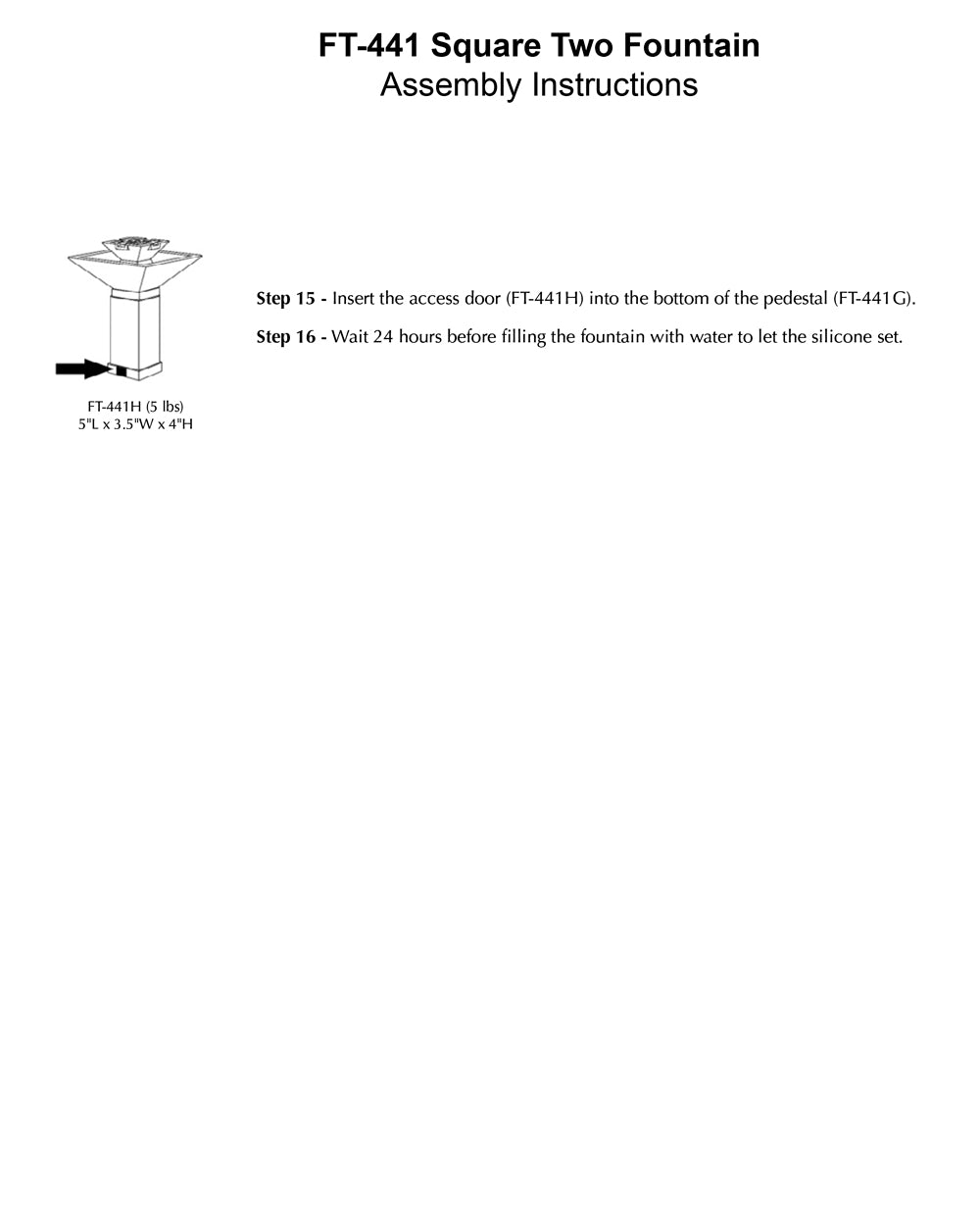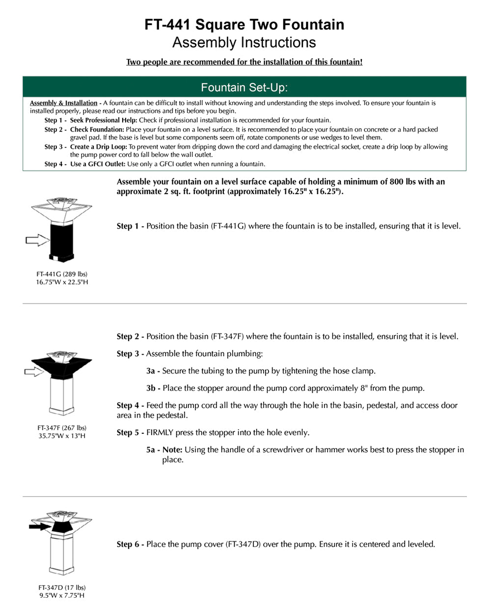 We suggest that birdbath/fountain tops not be left outside in the winter. Once the top fills with water/snow and freezes, the top may crack. All birdbath/fountain bases, bench legs and statuary should be raised up off the ground in winter so they will not freeze to the ground surface. Ideally, a fountain should be stored indoors in the winter away from the elements. However, if a fountain bowl must be left outside, remove all pumps, rubber stoppers, drain pipes, finials and small components, and cover the top with burlap or any absorbent material (old blanket/towel) and then wrapped with dark plastic, making sure that water does not accumulate in the basin and freeze. Fountain pumps, finials, and other small components should be stored indoors. Check the fountain periodically to insure that the cover is secure and water is not accumulating in any fountain component.