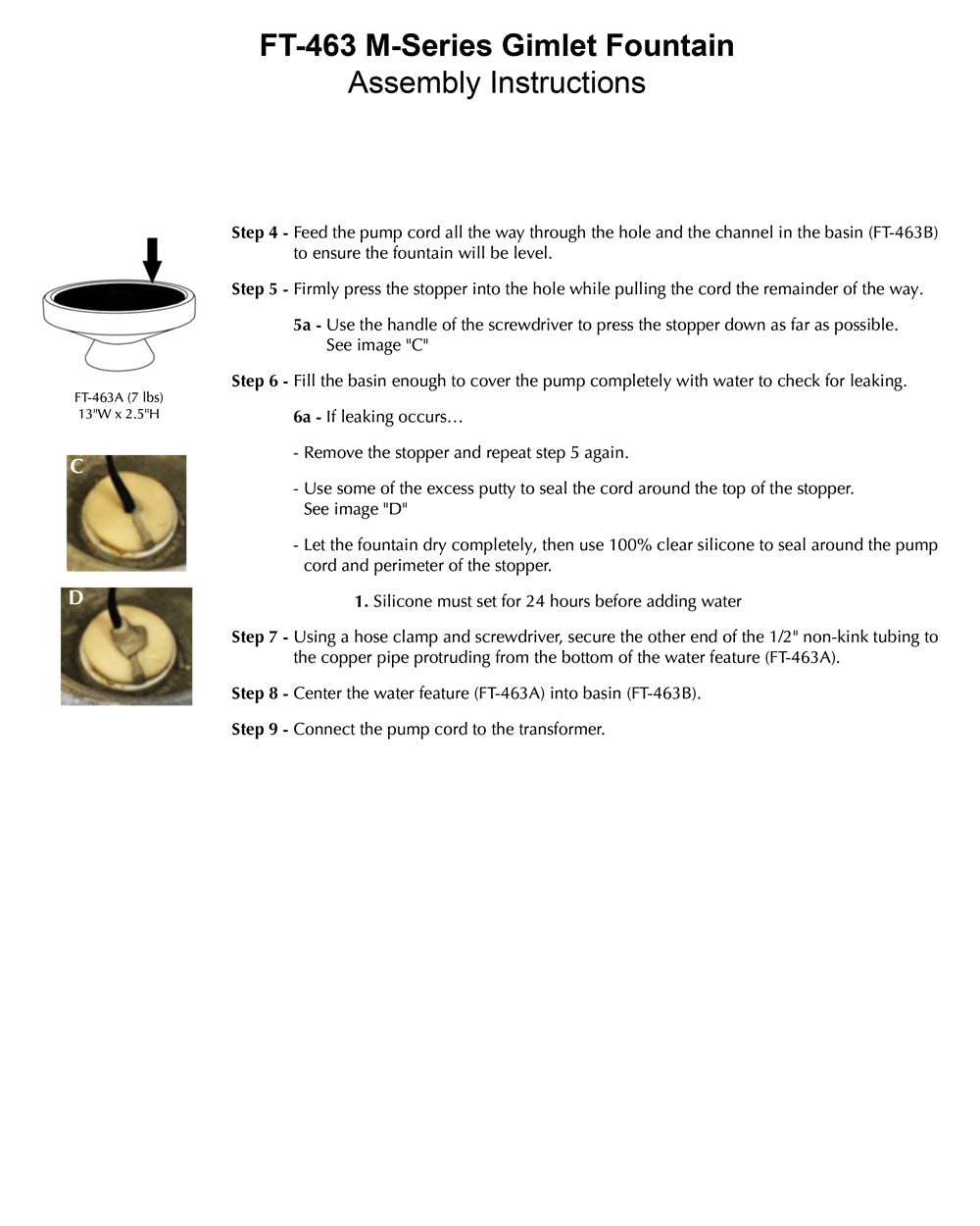 We suggest that birdbath/fountain tops not be left outside in the winter. Once the top fills with water/snow and freezes, the top may crack. All birdbath/fountain bases, bench legs and statuary should be raised up off the ground in winter so they will not freeze to the ground surface. Ideally, a fountain should be stored indoors in the winter away from the elements. However, if a fountain bowl must be left outside, remove all pumps, rubber stoppers, drain pipes, finials and small components, and cover the top with burlap or any absorbent material (old blanket/towel) and then wrapped with dark plastic, making sure that water does not accumulate in the basin and freeze. Fountain pumps, finials, and other small components should be stored indoors. Check the fountain periodically to insure that the cover is secure and water is not accumulating in any fountain component.