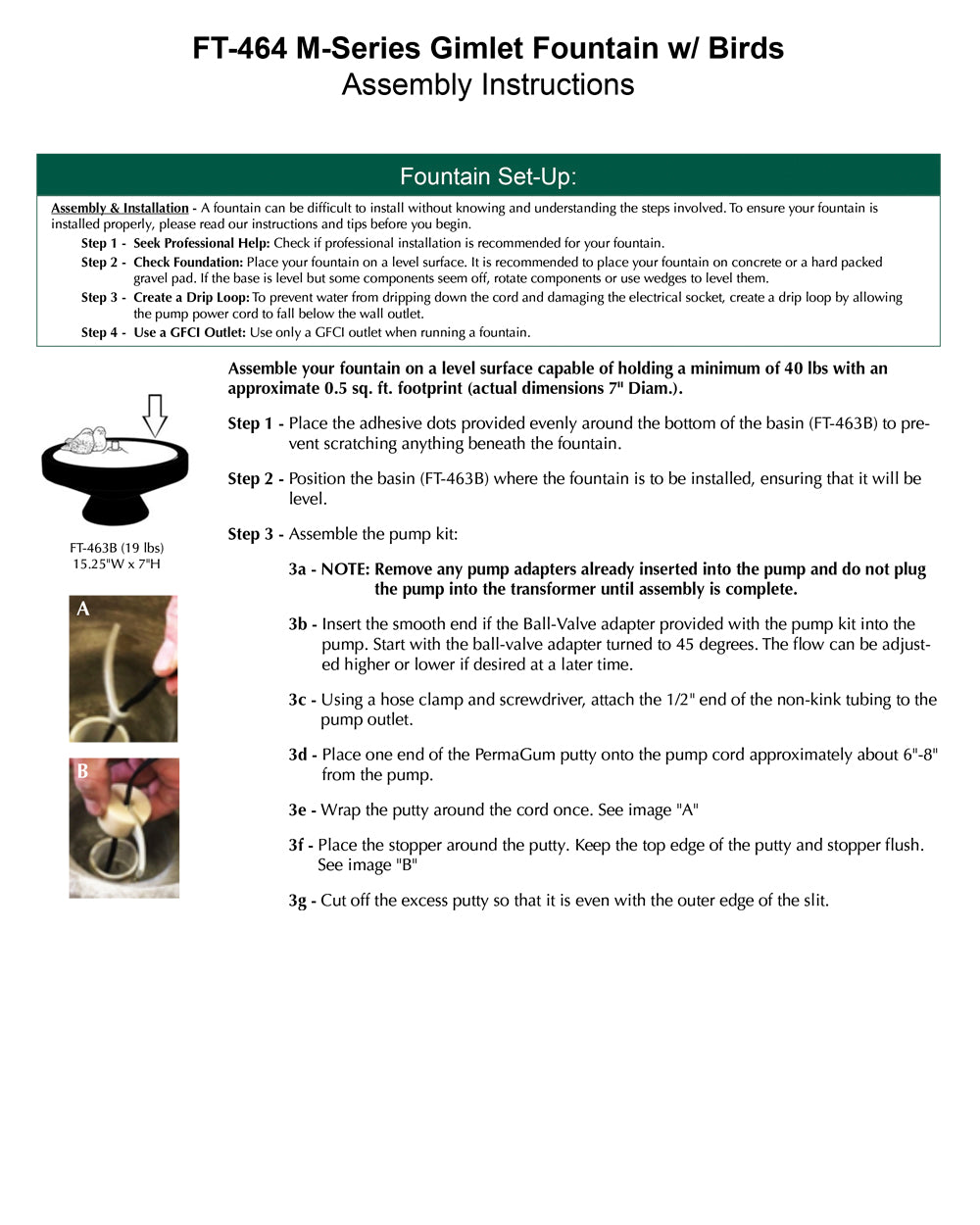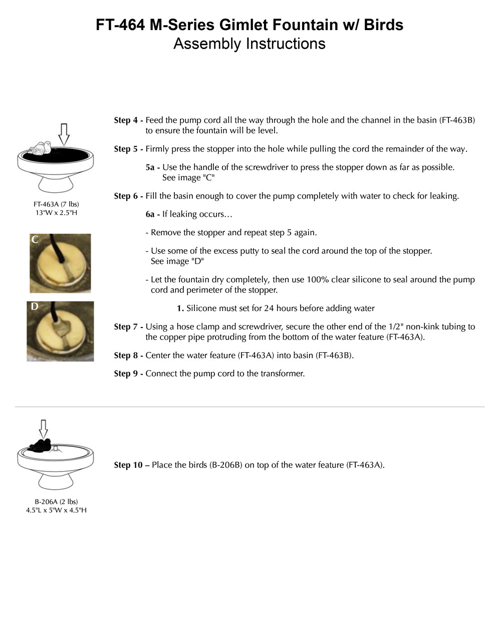 We suggest that birdbath/fountain tops not be left outside in the winter. Once the top fills with water/snow and freezes, the top may crack. All birdbath/fountain bases, bench legs and statuary should be raised up off the ground in winter so they will not freeze to the ground surface. Ideally, a fountain should be stored indoors in the winter away from the elements. However, if a fountain bowl must be left outside, remove all pumps, rubber stoppers, drain pipes, finials and small components, and cover the top with burlap or any absorbent material (old blanket/towel) and then wrapped with dark plastic, making sure that water does not accumulate in the basin and freeze. Fountain pumps, finials, and other small components should be stored indoors. Check the fountain periodically to insure that the cover is secure and water is not accumulating in any fountain component.