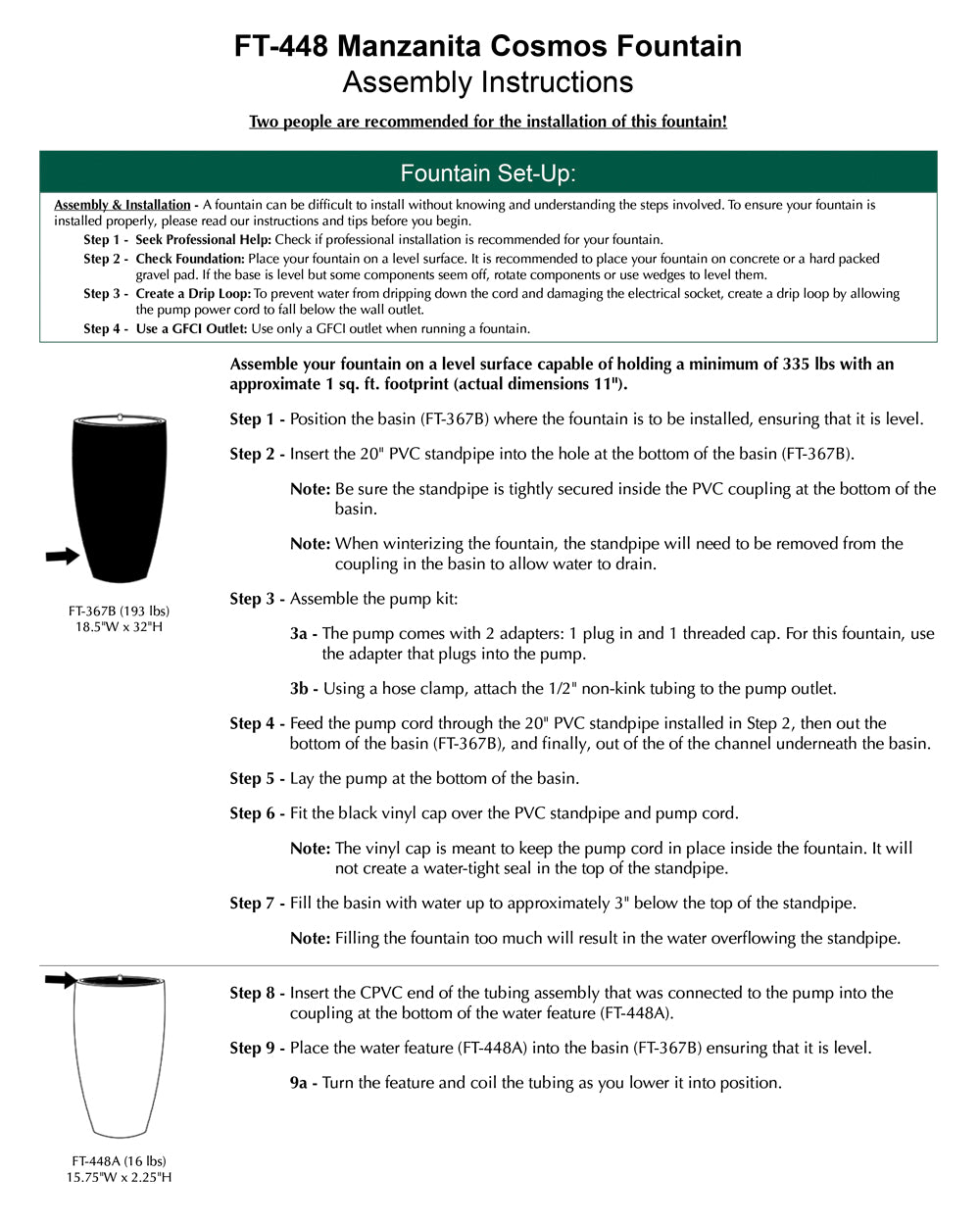 We suggest that birdbath/fountain tops not be left outside in the winter. Once the top fills with water/snow and freezes, the top may crack. All birdbath/fountain bases, bench legs and statuary should be raised up off the ground in winter so they will not freeze to the ground surface. Ideally, a fountain should be stored indoors in the winter away from the elements. However, if a fountain bowl must be left outside, remove all pumps, rubber stoppers, drain pipes, finials and small components, and cover the top with burlap or any absorbent material (old blanket/towel) and then wrapped with dark plastic, making sure that water does not accumulate in the basin and freeze. Fountain pumps, finials, and other small components should be stored indoors. Check the fountain periodically to insure that the cover is secure and water is not accumulating in any fountain component.