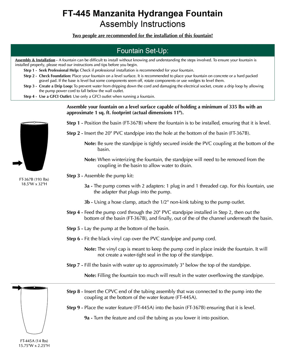 We suggest that birdbath/fountain tops not be left outside in the winter. Once the top fills with water/snow and freezes, the top may crack. All birdbath/fountain bases, bench legs and statuary should be raised up off the ground in winter so they will not freeze to the ground surface. Ideally, a fountain should be stored indoors in the winter away from the elements. However, if a fountain bowl must be left outside, remove all pumps, rubber stoppers, drain pipes, finials and small components, and cover the top with burlap or any absorbent material (old blanket/towel) and then wrapped with dark plastic, making sure that water does not accumulate in the basin and freeze. Fountain pumps, finials, and other small components should be stored indoors. Check the fountain periodically to insure that the cover is secure and water is not accumulating in any fountain component.