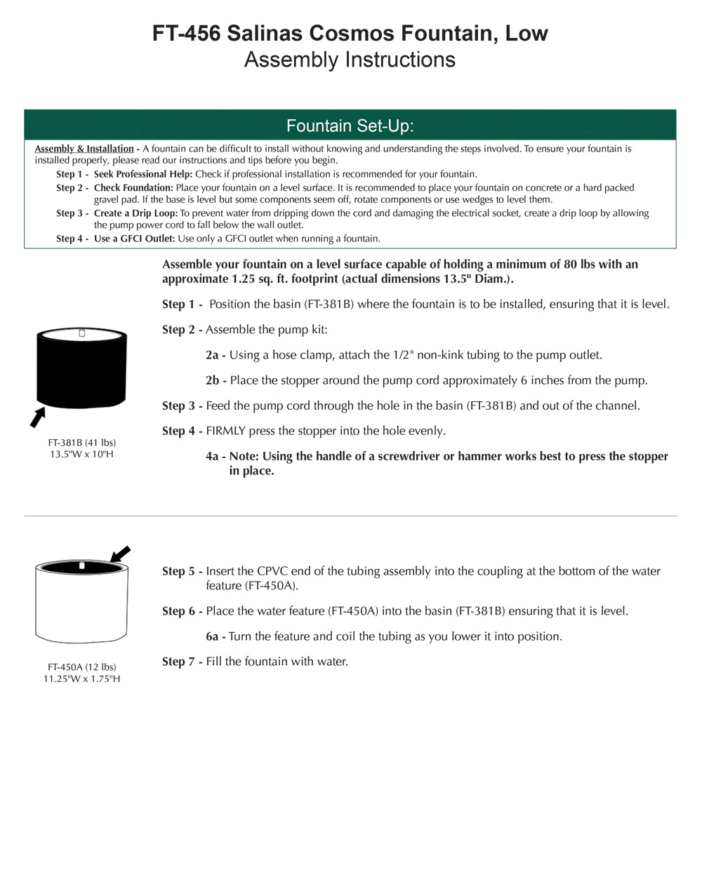 We suggest that birdbath/fountain tops not be left outside in the winter. Once the top fills with water/snow and freezes, the top may crack. All birdbath/fountain bases, bench legs and statuary should be raised up off the ground in winter so they will not freeze to the ground surface. Ideally, a fountain should be stored indoors in the winter away from the elements. However, if a fountain bowl must be left outside, remove all pumps, rubber stoppers, drain pipes, finials and small components, and cover the top with burlap or any absorbent material (old blanket/towel) and then wrapped with dark plastic, making sure that water does not accumulate in the basin and freeze. Fountain pumps, finials, and other small components should be stored indoors. Check the fountain periodically to insure that the cover is secure and water is not accumulating in any fountain component.