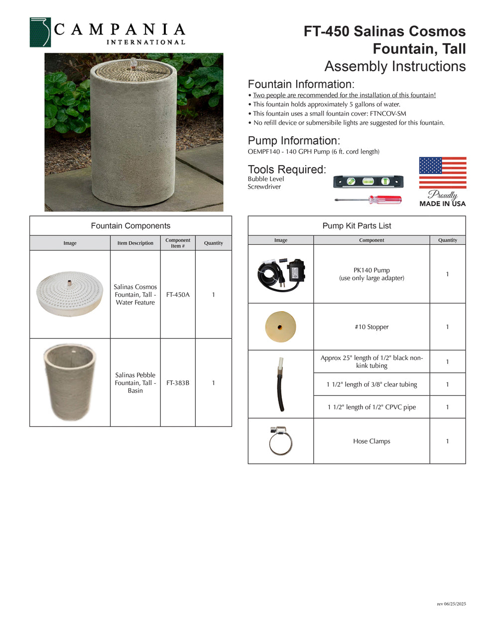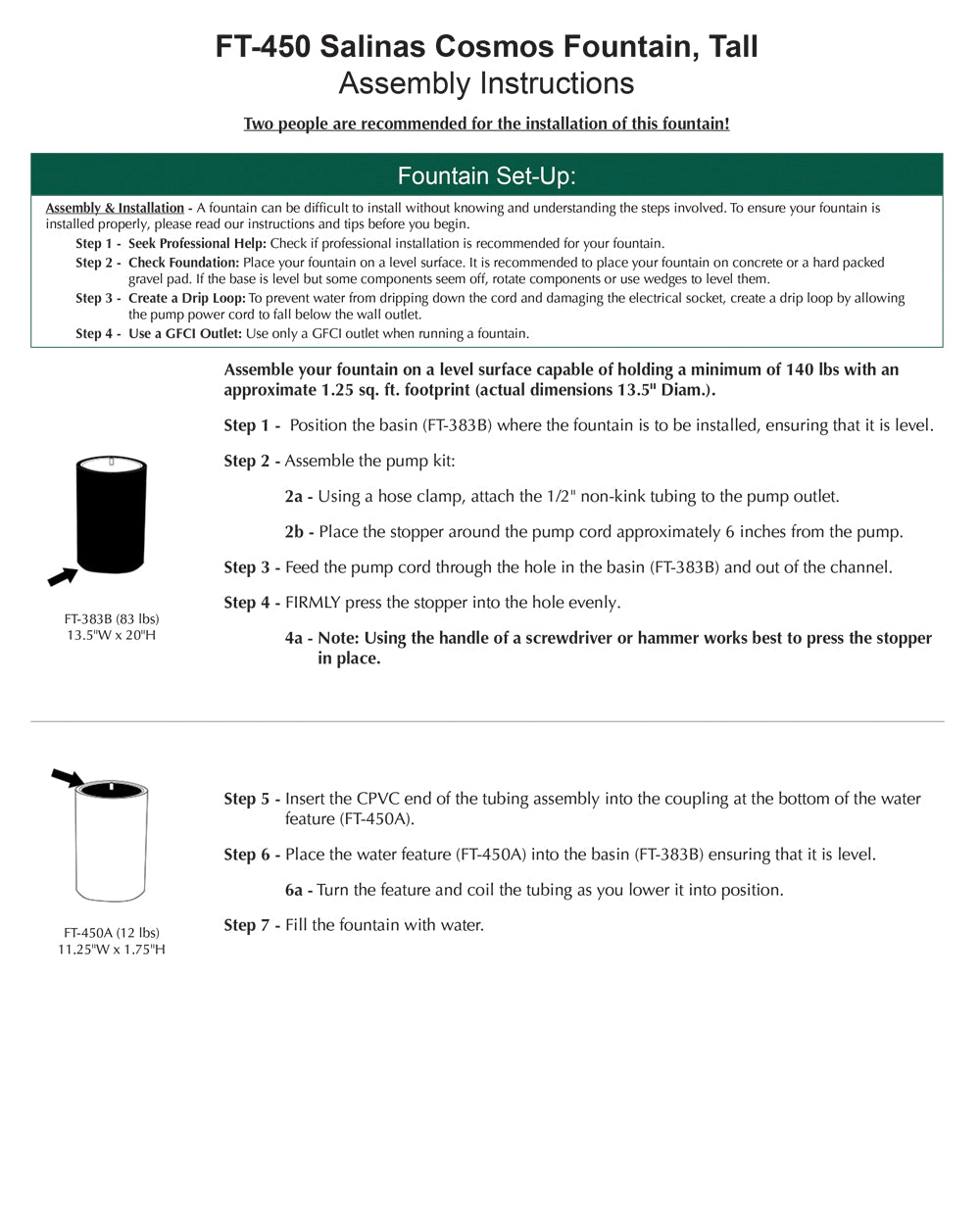 - All hardware and tubing required to properly assemble the fountain