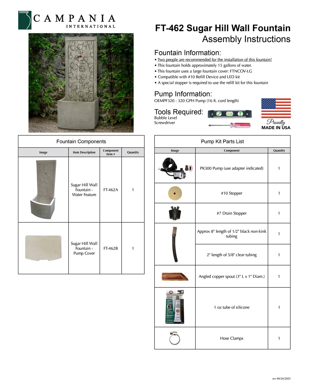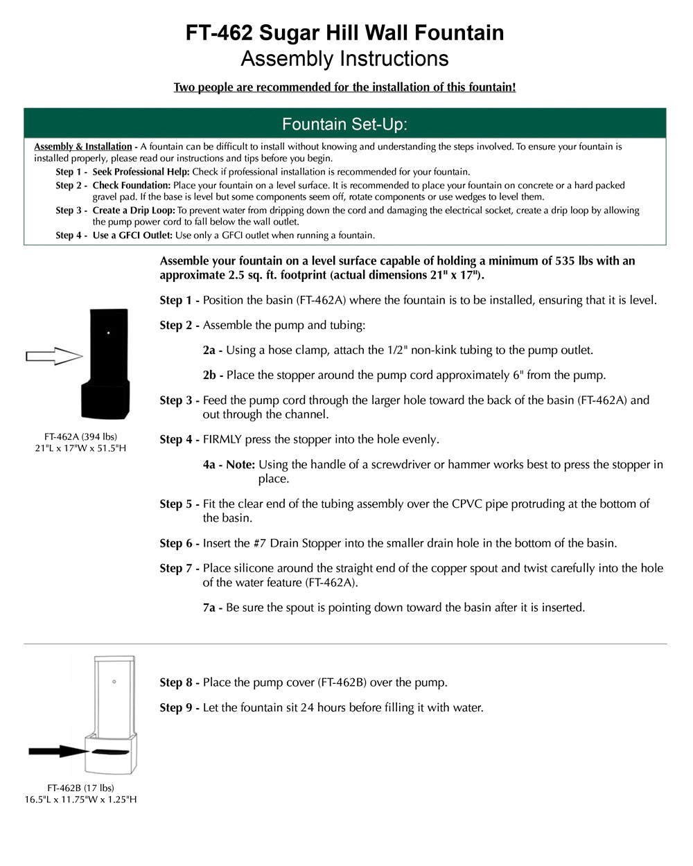 - All hardware and tubing required to properly assemble the fountain