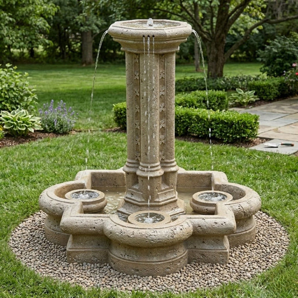 An elegant Victorian Britain inspired water feature, the Victorian Small Garden Fountain in Quatrefoil Basin is an exquisite addition for your garden. The fountain features a gorgeously sculpted column with extremely intricate carved patterns, a gorgeous finial, and a gorgeous display of water flowing from the top into the three small basins inside the pool in three glittering streams. Ideally used as a centerpiece, the fountain can also be used as an accent piece as the fountain will create a relaxing atmosphere that will instantly transform your outdoor area into an elegant, tranquil space.
